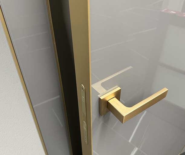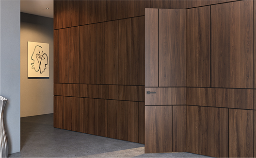 Двери комплектуются скрытыми, регулируемые в трех плоскостях и с открыванием до 180°(зависит от способа монтажа), петлями и бесшумными магнитными замками с пластиковым язычком итальянского производства. Доступны к заказу раздвижные двери и стеновые панели в цвет дверей.