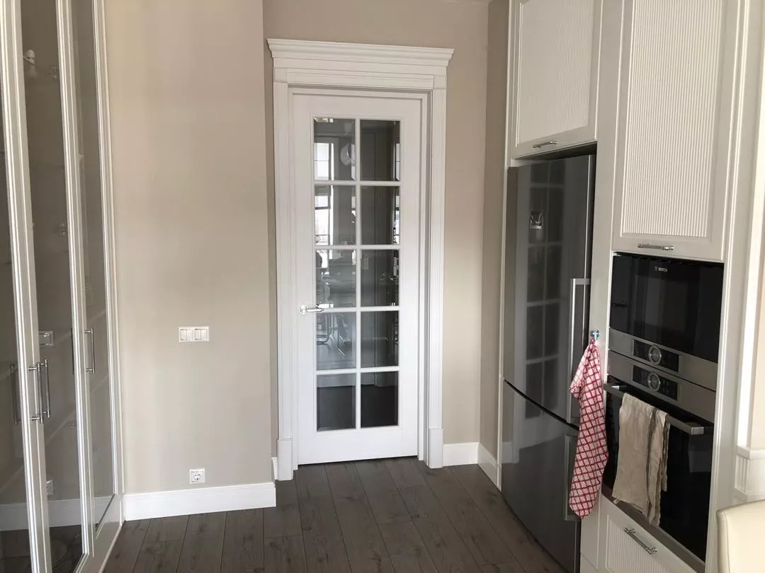 • Двери со стеклянными вставками: Целиковое стекло (алюминиевый каркас полотна) или стекло в алюминиевой либо деревянной обвязке. Добавляют легкость и пропускают свет (актуально для кухни, особенно в небольшой квадратуре).
