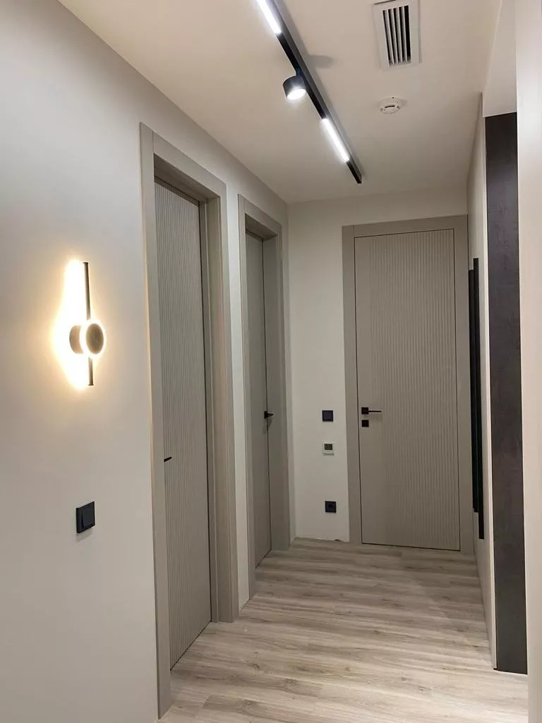 • Современный стиль: Полотна на компланарном коробе (плоскость наличника совпадает с плоскостью полотна) или скрытом коробе (без декоративного наличника) с трендовыми фрезеровками или небольшими стеклянными вставками.